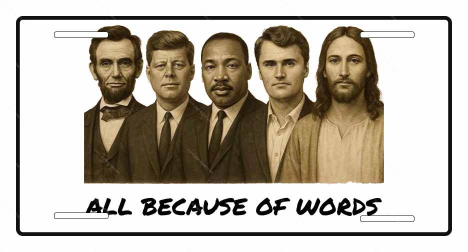 All Because Of Words Martyr Lincoln, Kennedy, MLK, Kirk, Jesus License Plate P-1078